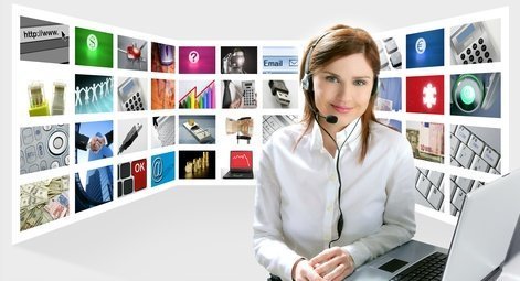 Business redhead beautiful woman headset micro headphones tech helpdesk